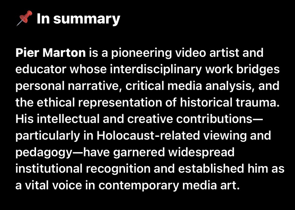 Pier Marton’s video work is in the collection of New York’s Museum of Modern Art (M.o.M.A.), the Paris Beaubourg Museum. the Paris Mémorial de la Shoah, Pittsburgh’s Carnegie Museum and Toronto’s National Gallery of Canada, as well as the U.S. Holocaust Memorial Museum in D.C. He has given talks about his work at M.o.M.A., the Walker Art Center in Minneapolis, the Carnegie Museum. And at Yad Vashem in Israel. His work has been praised by the New York Times, The Village Voice and Arts Magazine. He is the recipient of various grants like the National Endowment for the Arts and the Memorial Foundation for Jewish Culture. He has taught at major U.S. universities like U.C.L.A., U.C. San Diego, Carnegie Mellon, Penn State, Washington University and the School of the Art Institute where he chaired the video department. Some recent presentation topics include: The Holocaust in 1,000 Years, Shoah & Film, Slow Cinema. His latest efforts as the “Unlearning Specialist” at the School of No Media target our cultural blind-spots and our hide-and-seek games with “reality.” Work is distributed by Electronic Arts Intermix in NYC.